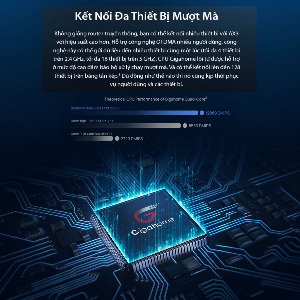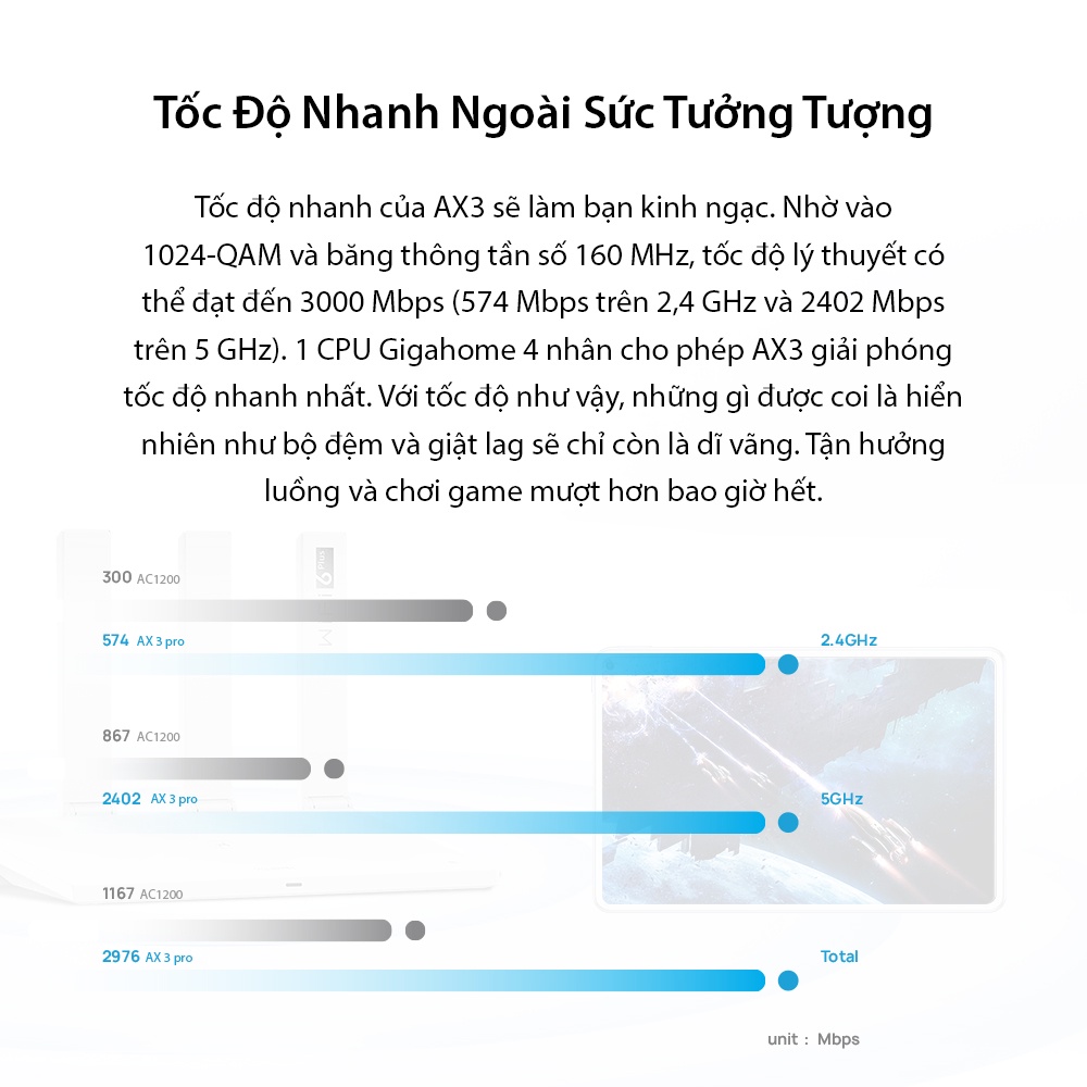 Tốc độ nhanh của AX3 sẽ làm bạn kinh ngạc. Nhờ vào 1024-QAM và băng thông tần số 160 MHz, tốc độ lý thuyết có thể đạt đến 3000 Mbps (574 Mbps trên 2,4 GHz và 2402 Mbps trên 5 GHz). 1 CPU Gigahome 4 nhân cho phép AX3 giải phóng tốc độ nhanh nhất. Với tốc độ như vậy, những gì được coi là hiển nhiên như bộ đệm và giật lag sẽ chỉ còn là dĩ vãng. Tận hưởng luồng và chơi game mượt hơn bao giờ hết.