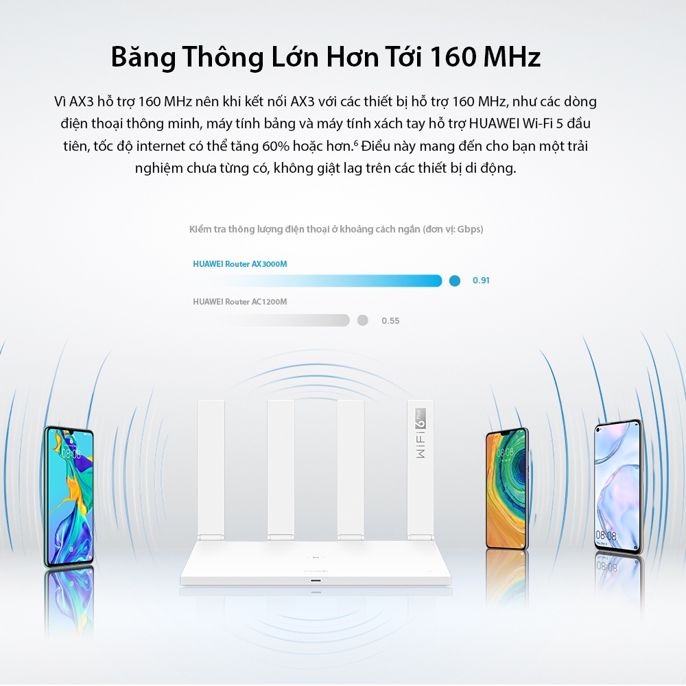 AX3 và điện thoại hỗ trợ HUAWEI Wi-Fi 6 là cặp đôi hoàn hảo vì cả hai đều được trang bị Wi-Fi chipset do HUAWEI tự phát triển, có hỗ trợ băng thông tần số 160 MHz. Điều này đặt nền móng cho Chipset Synergy, mang đến tốc độ và hiệu suất tối ưu.